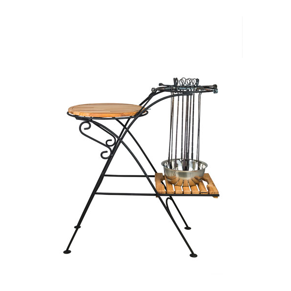 Стойка-солнышко - удобная многоярусная система, которая может использоваться как подставка под крышку тандыра. Также у стойки есть поверхности для нарезки овощей и мяса, для приготовления блюд. На такую поверхность можно поставить посуду для выкладки готового блюда. Приспособление имеет стальной каркас с защитным черным покрытием и деревянные поверхности. Также имеется конструкция в форме стального кольца.