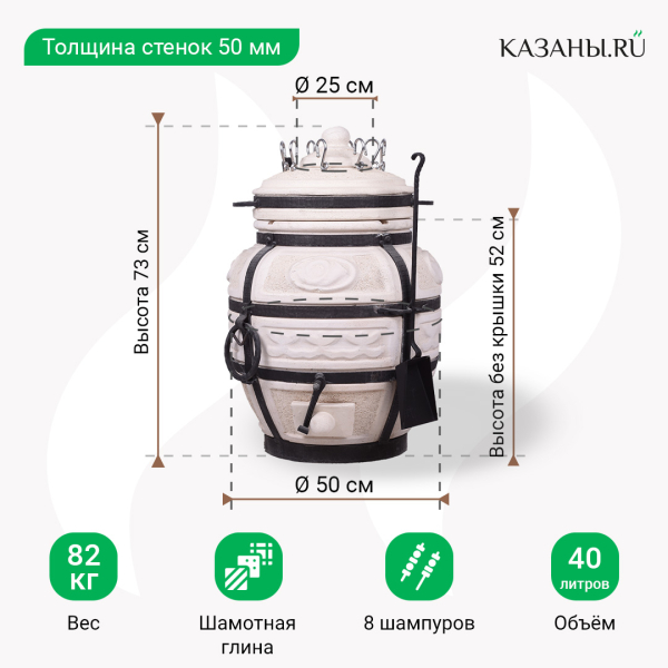 Тандыр "Охотник" - не самый маленький. Его высота с крышкой составляет 76 см, без крышки - 57 см. Диаметр жаровни - 49 см, горловины - 25. При выборе аксессуаров для приготовления блюд надо ориентироваться на диаметр горловины - устройство должно войти внутрь тандыра. Вес конструкции составляет 70 кг. Толщина стенок у печи классическая - 5 см.