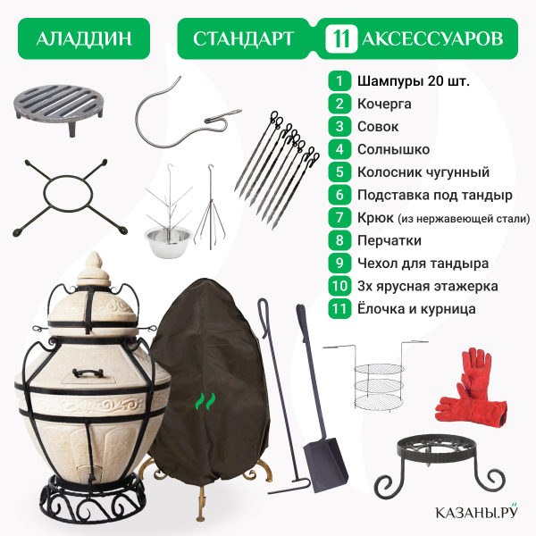 Высота тандыра с крышкой - 120 см, без крышки - 83 см. Диаметр жаровни составляет 83 см, диаметр горловины - 35 см. Толщина стенок очага - 7 см. Печь поставляется с набором из 20 шампуров, подставкой под тандыр и подставкой под крышку, держателем для шампуров, совком, кочергой, чугунным колосником. Поставки и аксессуары имеют элементы ковки, которые служат в качестве дополнительного украшения тандыра. В изделиях выделяются декоративные завитки и узоры.